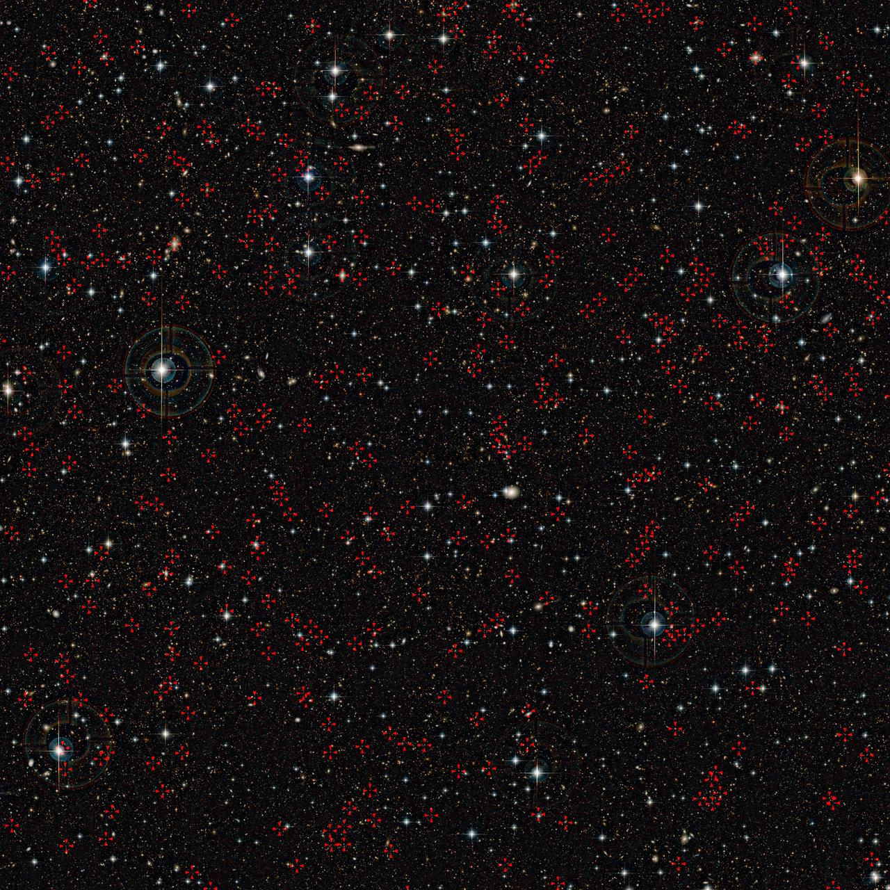 Some of the Super-massive Black Holes don’t have any material nearby to eat. But others have a buffet table of cosmic goodies within reach. The Super-massive Black Holes that are currently eating are easier to find in the Universe, as the doomed space material shines brightly before it disappears forever into the monster’s mouth. Some galaxies that contain this type of Super-massive Black Hole are marked with red crosses in the picture above.