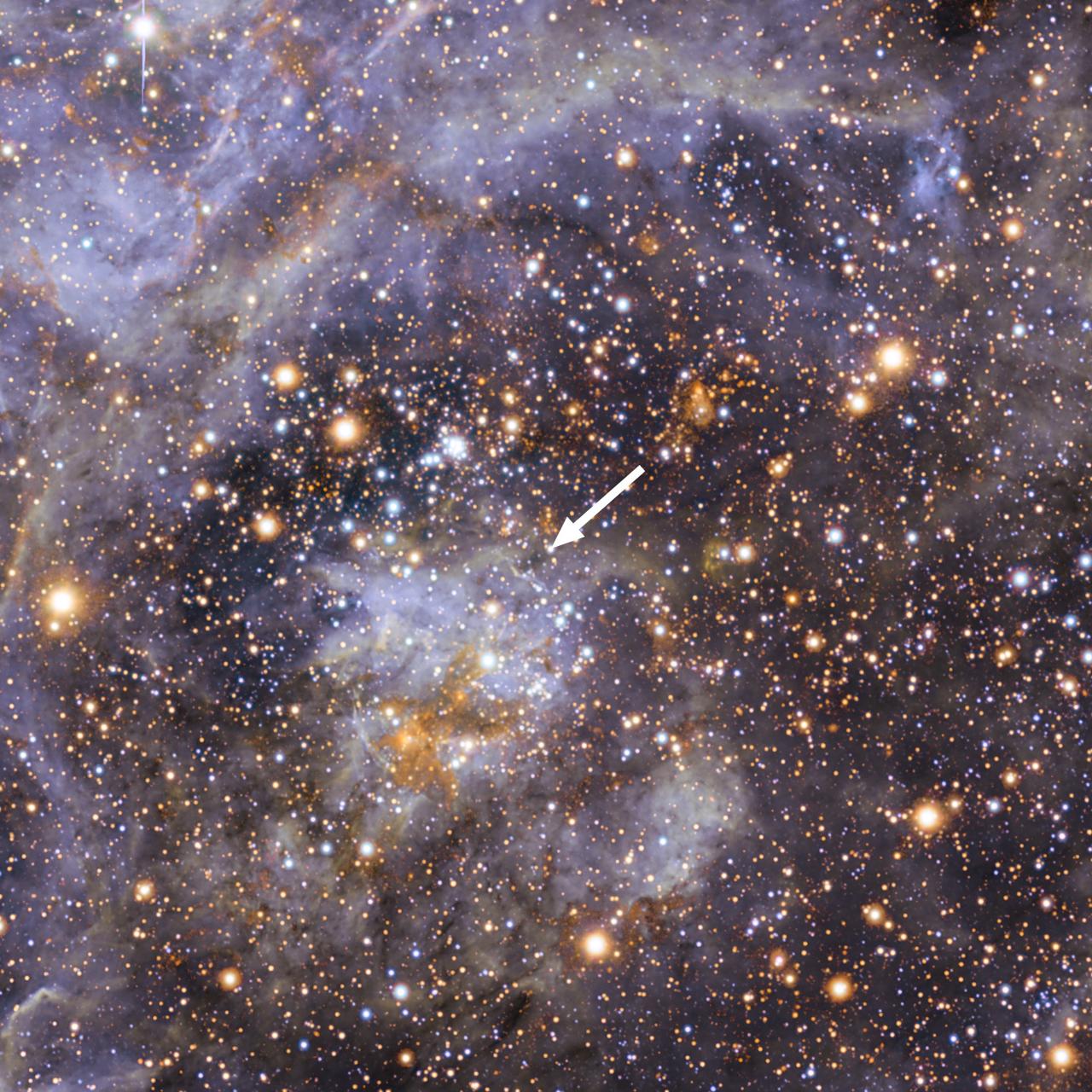 Strzałka na powyższym zdjęciu wskazuje gwiazdę, która jest przedmiotem śledztwa. Próba zrozumienia rotacji i ruchu tak różniącego się od ruchu pozostałych gwiazd, doprowadziła astronomów do obmyślenia scenariusz wydarzeń. Gwiazda ta pierwotnie mogła być składnikiem układu podwójnego. Jeśli dwie gwiazdy takiego układu znajdowały się bardzo blisko siebie to nasza gwiazda mogła zwiększać swoją rotację pożerając materię pochodzącą od swojego kompana, który stał się dla niej energetyczną przekąską!