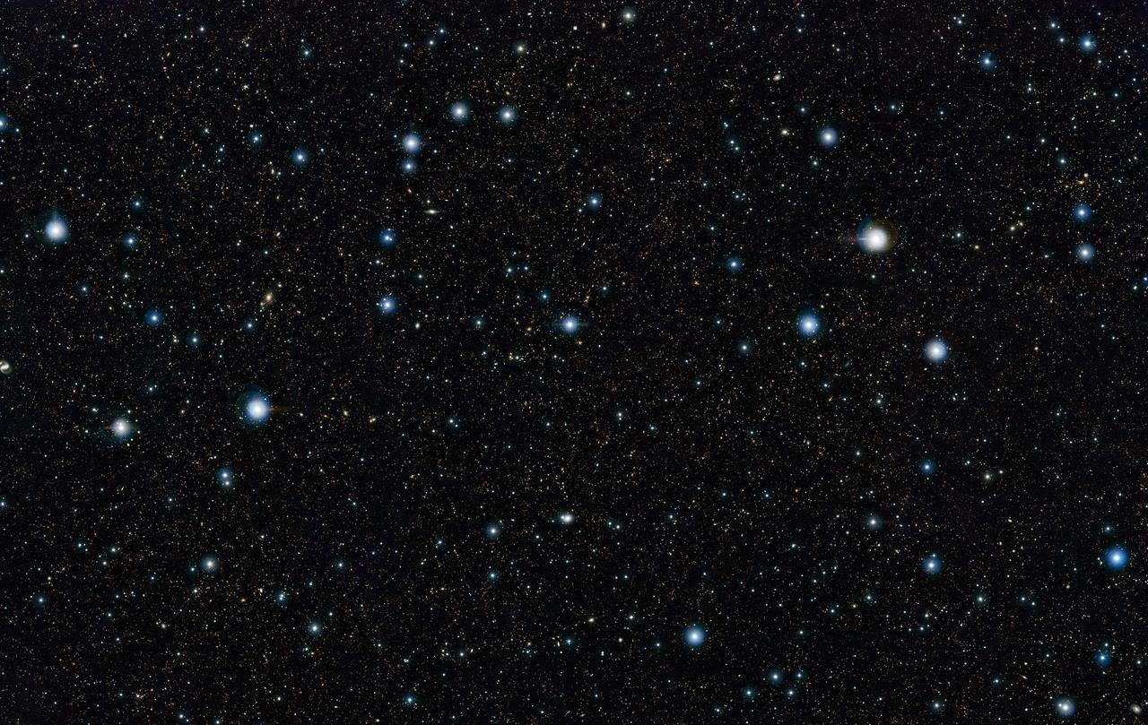 La prima vedere în acestă fotografie din spațiu nu vedem nimic deosebit, doar câteva stele strălucitoare și altele mai puțin strălucitoare împrăștiate în jurul lor. Aceste stele împrăștiate nu sunt stele din galaxia noastră, Calea Lactee. Ele reprezintă galaxii foarte îndepărtate, fiecare conținând miliarde de stele!