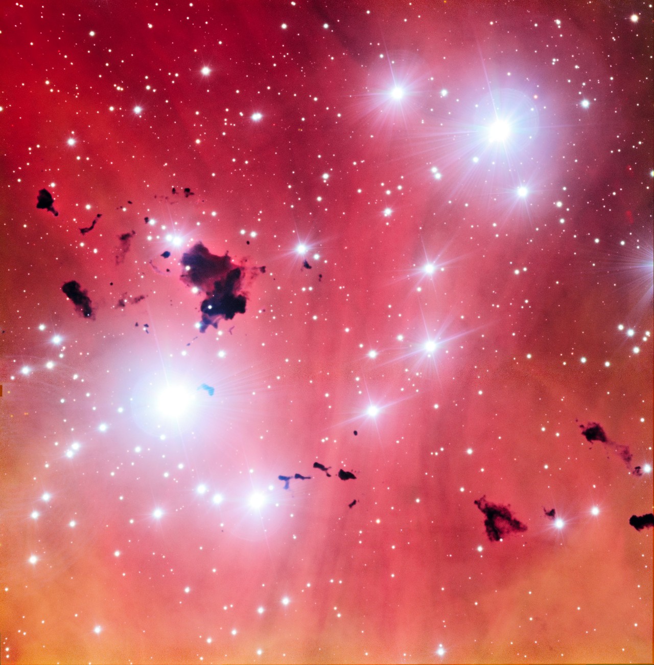 Silhouetted against the glowing pink gas are clouds which look like “balloons”: even thicker clumps of dust, known as Thackery's globules. These globules are being sculpted into these funny shapes by powerful radiation shooting out of the hot, blue baby stars nearby. Their high-energy rays erode the clouds and break them down, like lumps of butter dropped onto a hot frying pan. Unfortunately, because of this Thackeray’s globules will most likely be destroyed before they themselves can collapse down to form new stars.