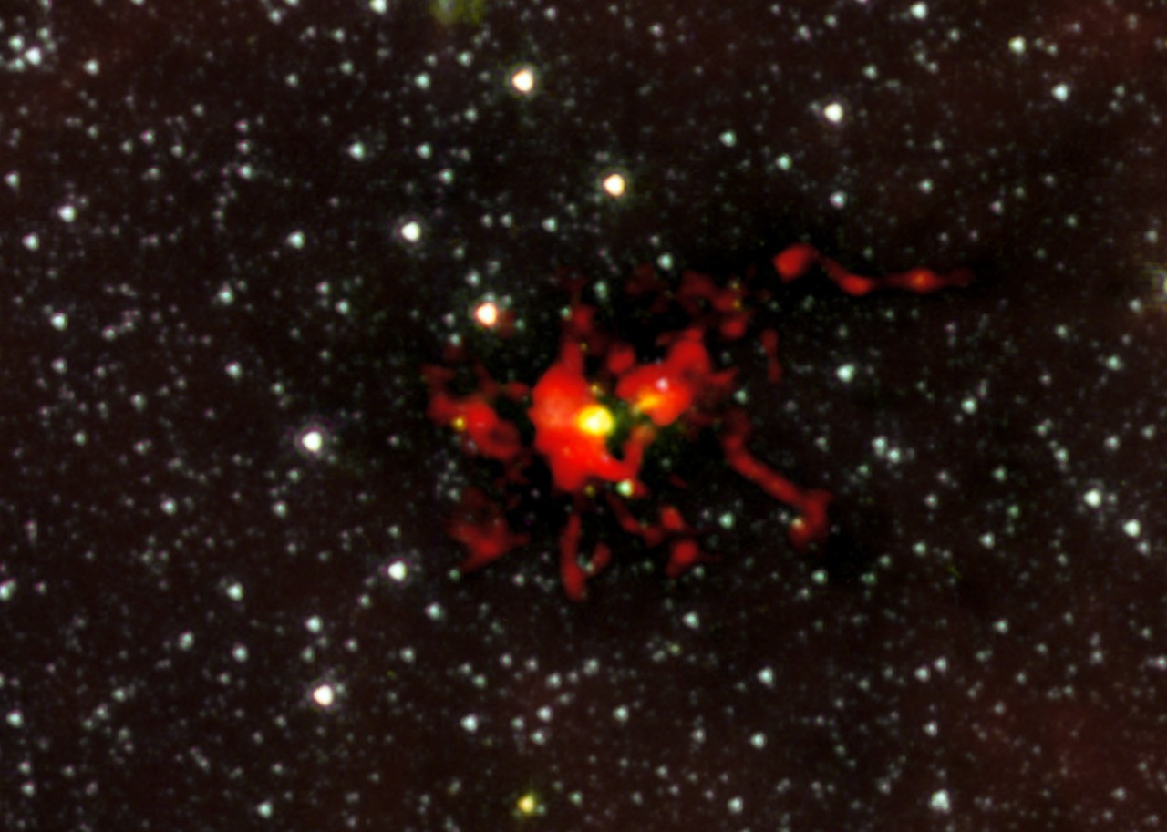 Uten teleskoper til å samle dette eksotiske lyset, ville vi aldri sett store deler av objektene som svever rundt der ute. Den røde skyen i dette bildet, for eksempel, var usynlig for oss helt til et infrarødt teleskop snublet over det og avdekket dette bildet: en dramatisk region fylt med bånd av støv og gass. Etter denne oppdagelsen har astronomer bestemt seg for å se lengre innover i denne tykke skyen ved å bruke ALMA-teleskopet, et teleskop som samler radiobølger. De hadde ikke trodd at de kom til å avdekke at en gedigen stjerne vokser på innsiden av denne støvete skyen!