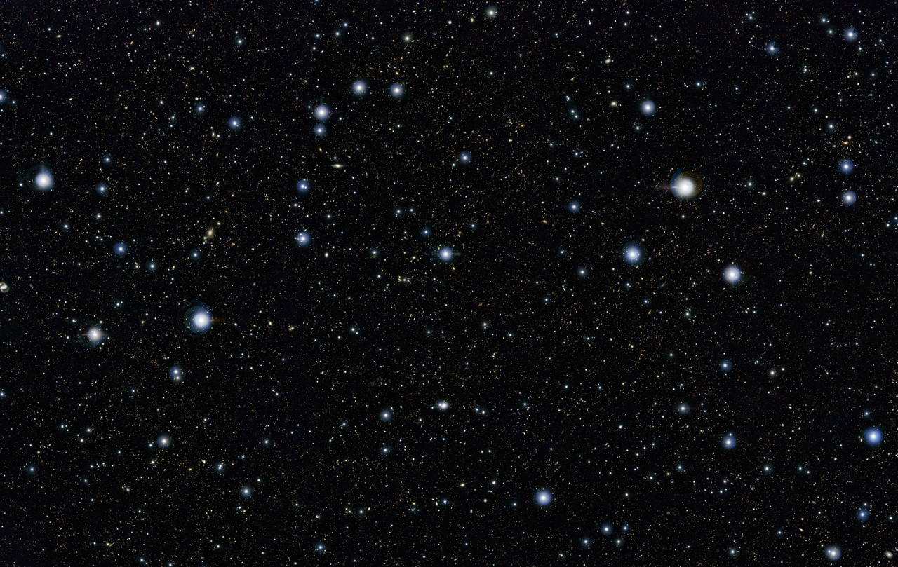La oss forestille oss at dette bildet er utsikten fra soveromsvinduet ditt. Hva er det første du legger merke til når du ser ut? Sannsynligvis de store, blå stjernene spredt utover bildet. Dette er stjerner i vår egen galakse. De er ganske nærme, som er grunnen til at de ser så store og lyse ut. Hvis du ser bedre etter, hva ser du? Det er hundrevis av fjerne galakser! Store spiralgalakser, irregulære og formløse galakser, unge og blå galakser, samt gamle, røde galakser. Dette bildet har alt! Er det ikke utrolig å tenke på at hver lille prikk i dette bildet er en galakse som består av milliarder av stjerner, hvor mange av dem er mye større en solen vår?