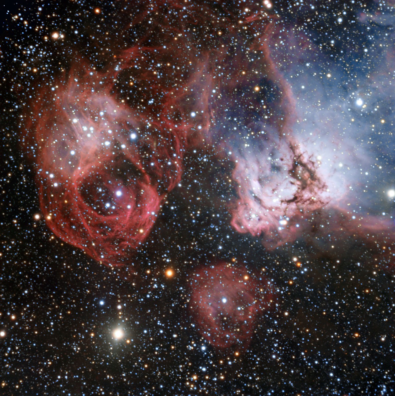 Dette nye bildet utforsker fargerike skyer av gass og støv kalt NGC 2035 (sett til høyre), som noen ganger kalles Dragehodetåken. De fargerike skyene av støv og gass er fylt av varme, nyfødte stjerner som får skyene rundt til å gløde. Dette er også områder hvor stjerner har endt sine liv i fantastiske supernovaeksplosjoner.