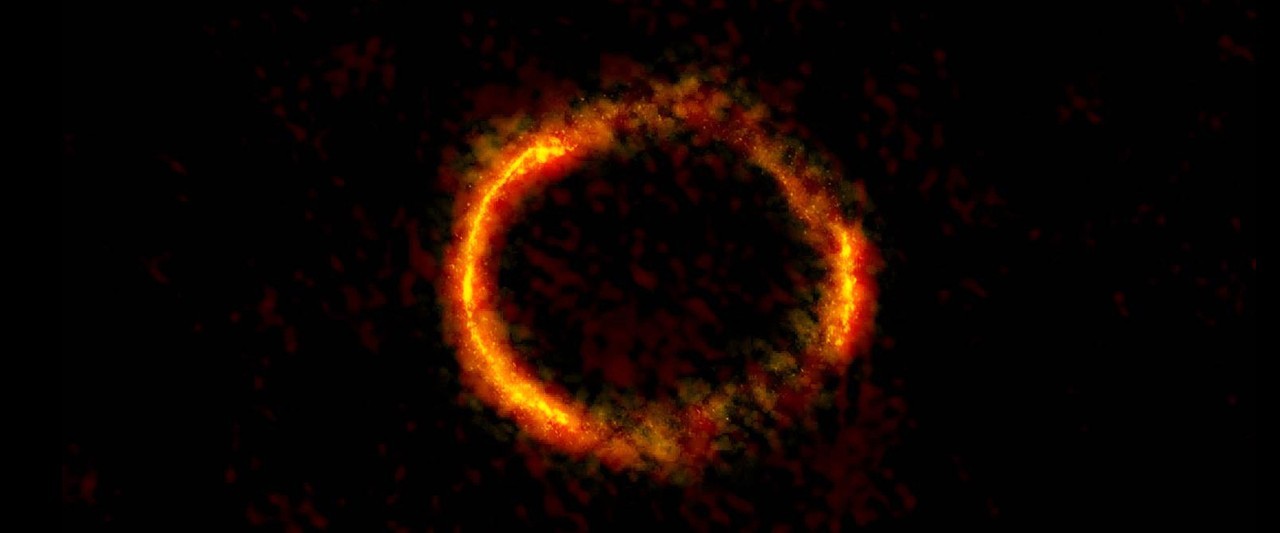 Эффект космического линзирования чрезвычайно силен на этом изображение. Свет далекой галактики согнут в кольцо. На самом деле галактика имеет не форму кольца, но в искаженном виде она выглядит именно так.