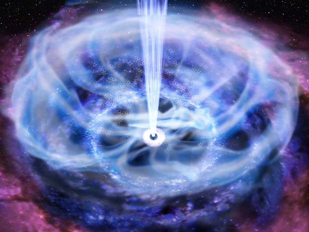 This looks like a picture of the powerful, planet-destroying laser beam from Star Wars or something else straight out of a sci-fi film, and it almost could be! What we're looking at is the centre of one of the most active galaxies in the Universe. Galaxy centres like this spew incredible amounts of energy – they are brighter than about 100 normal galaxies combined! And this is the first ever 3-D view of one of these monster galaxies!