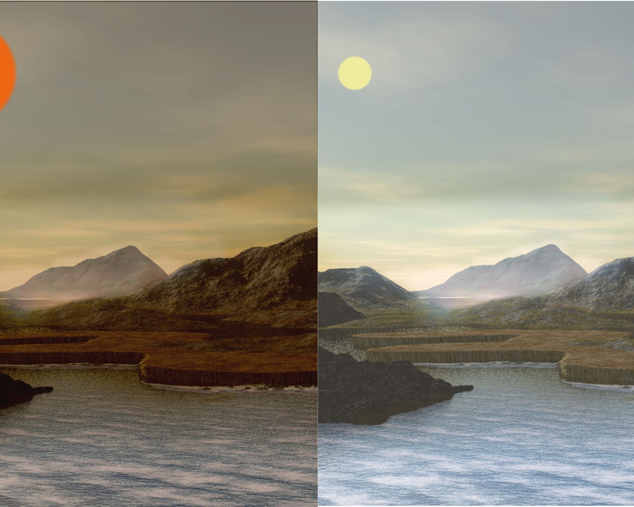 The image on the left shows a planet around a star smaller and cooler than the Sun. The starlight on this world would be different than on our home, however underwater conditions would be the same! This is because only only blue-green light can travel through meters of water.