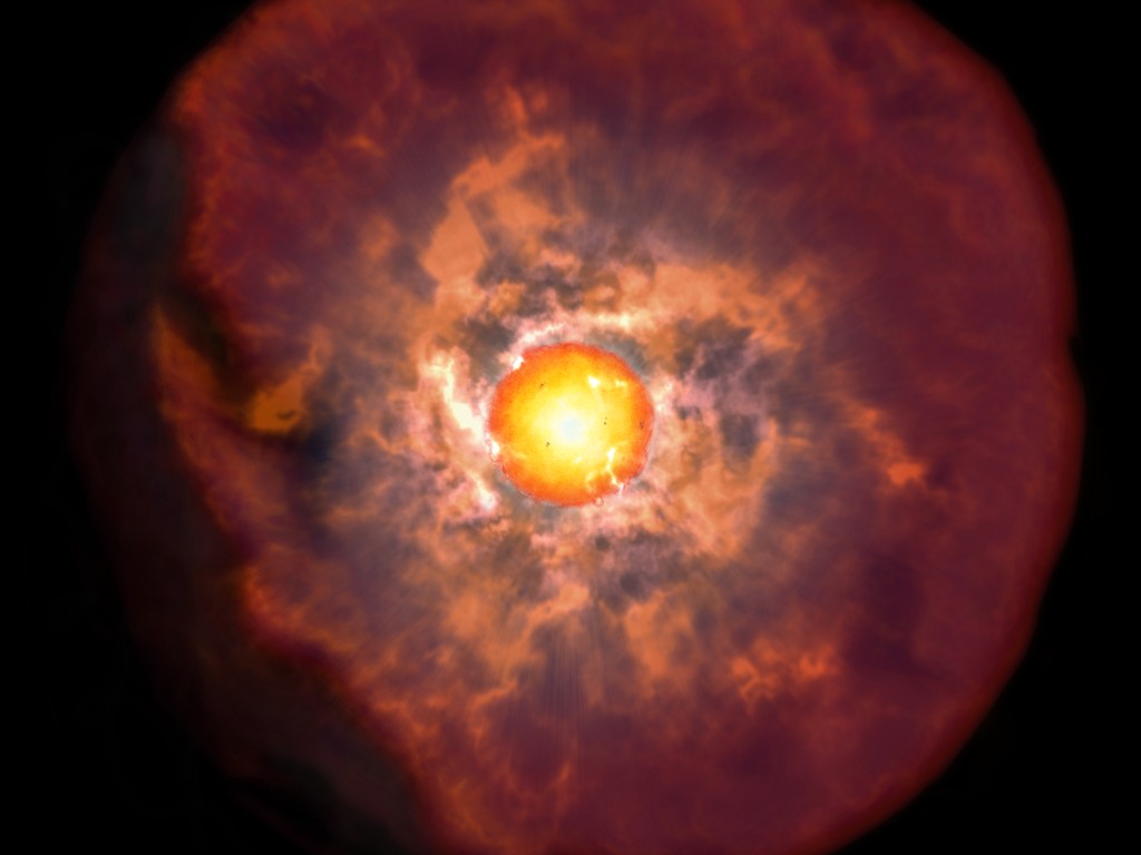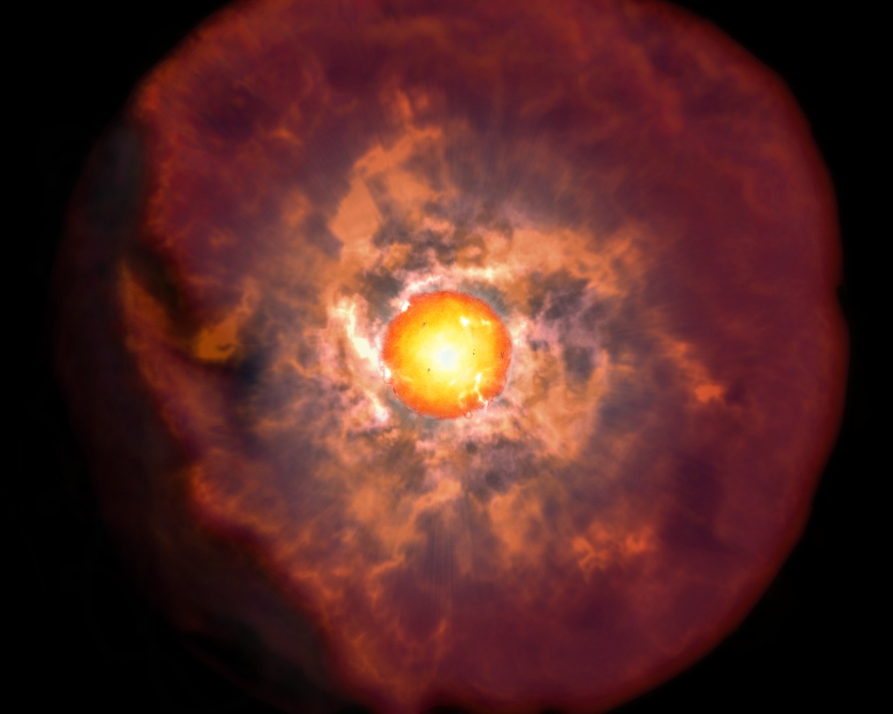 This picture is an artist’s impression of a red supergiant surrounded by a thick envelope cosmic dust.