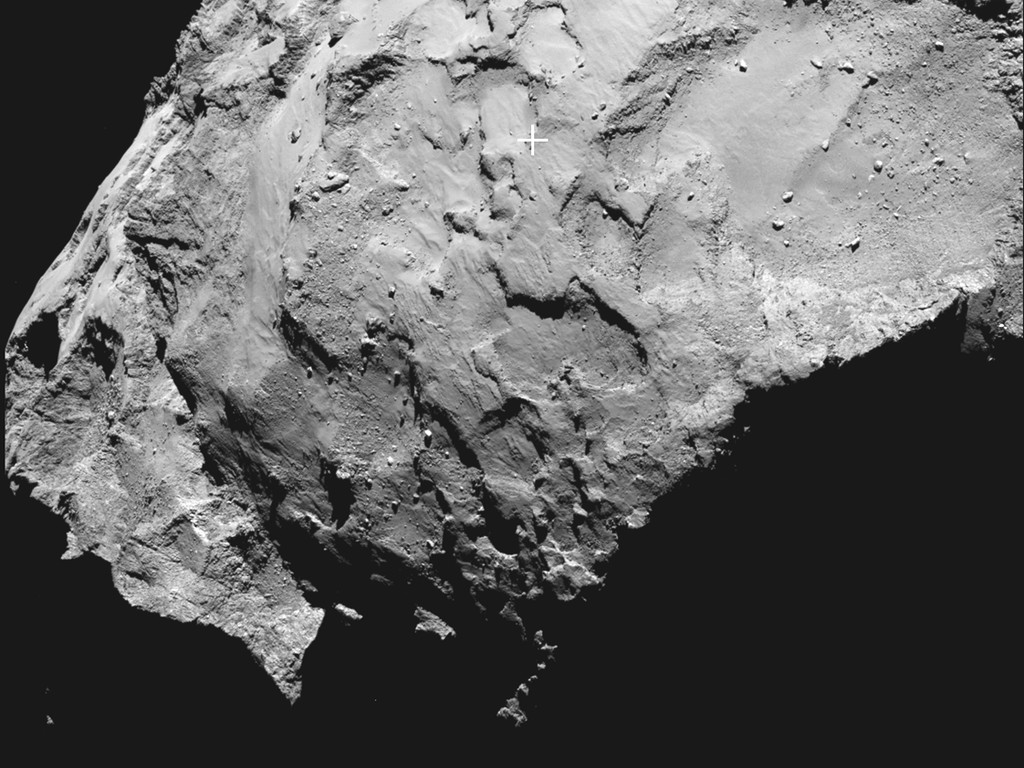 This amazingly detailed photograph of comet 67P/Churyumov–Gerasimenko shows the target landing site for Philae. The area located at the "head" of the comet has been labelled Site J, with the centre indicated by a cross. Site J was judged to be the safest site, with gentle slopes, few boulders and enough sunlight to keep the solar-powered probe alive.