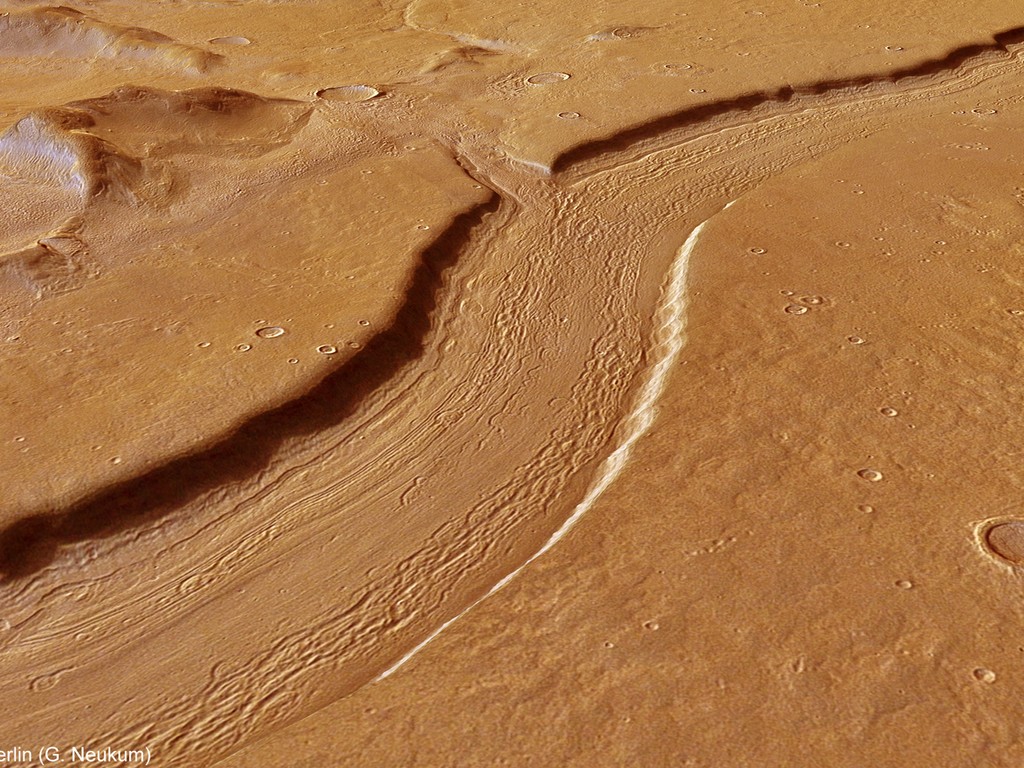 These amazing pictures were taken by the Mars Express spacecraft, which is orbiting around Mars. The first shows a river-like ditch winding across the surface of the planet. This is believed to have been carved by deep, flowing water in the distant Martian past, billions of years before humans even existed!