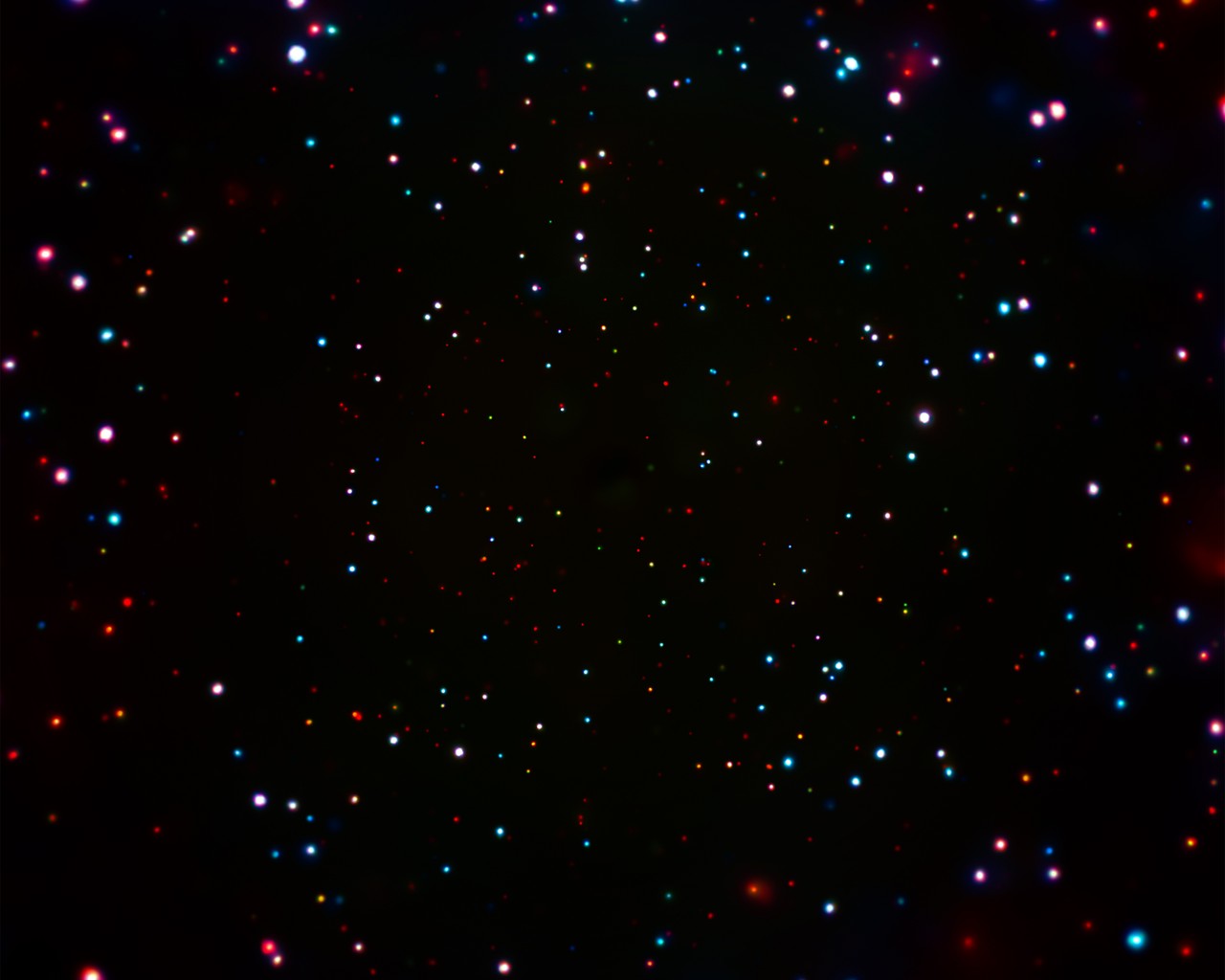 This picture shows us further into the Universe than we've ever seen in X-ray light, revealing lots of very faint objects that previous images weren't able to detect. Almost three-quarters of the points of light in this picture are distant black holes, the others are galaxies. The colours tell us how energetic each object is: objects with the least energy are red and the most energetic are blue.