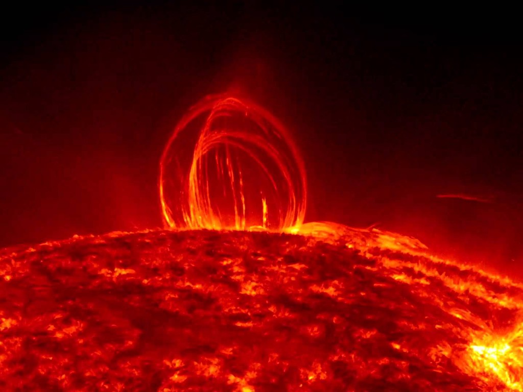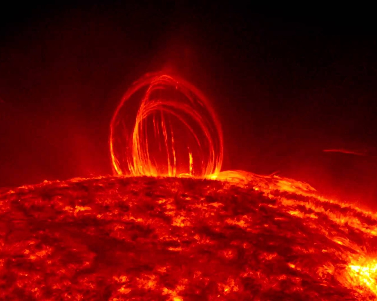 This pictures shows a towering loop of plasma rising over the Sun and raining down on its surface!