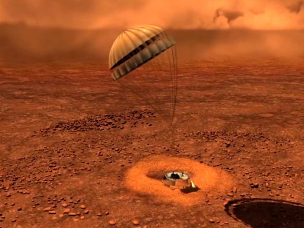 The Huygens probe lands on Titan's surface 14 January 2005.