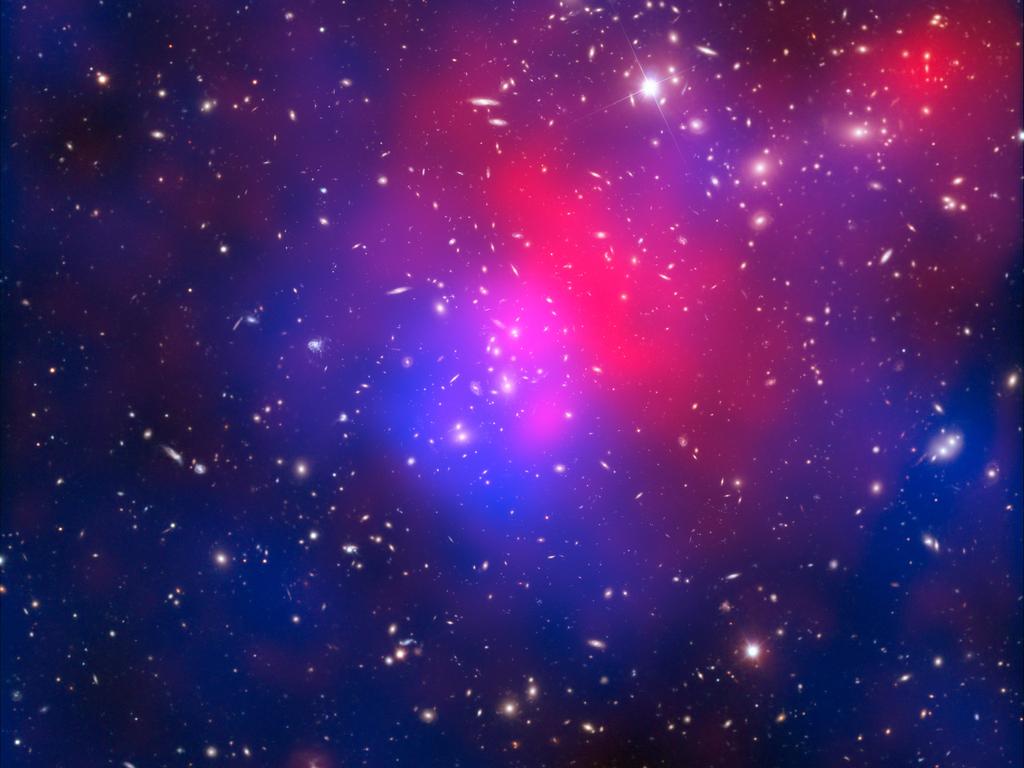 This picture shows a different group of galaxies that is much bigger than ours, which is called Pandora’s Cluster. The picture shows such a big part of the Universe that each galaxy only looks like a little white scratch on the photo! The galaxies are only a tiny part of what is really inside Pandora’s Cluster. It is also made up of hot gas (shown in pink in the photo) and lots of strange stuff that doesn’t give off any light at all – it is invisible to us! Astronomers call this invisible stuff ‘dark matter’.