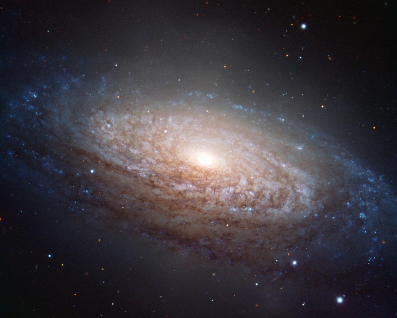 In the photo you can see that the colour of the galaxy is different in the centre and the outer regions. The galaxy looks more yellow and orange towards the centre (astronomers say it is “reddish”), while it is blue in the outer parts. This is because of the colours of the stars that are found in these regions of the galaxy. Older stars are redder than younger stars and live in the centre. Young stars are blue and live further out.