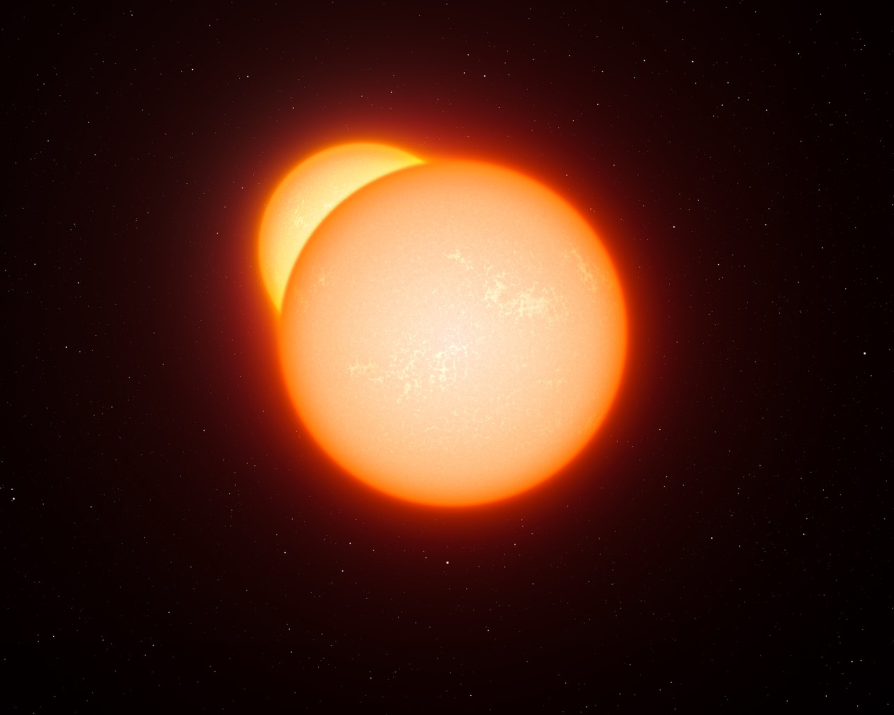 In the case of the Large Magellanic Cloud, its distance was determined by looking at pairs of stars that orbit each other. We call these 'binary systems'; you can see an artist's impression of one in this picture. From Earth, we see the stars regularly passing in front of each other. Each time this happens, the combined brightness of the stars drops. By tracking the changes in brightness very carefully, astronomers can work out all kinds of information: how big the stars are, how much material they have and even how far they are from Earth!