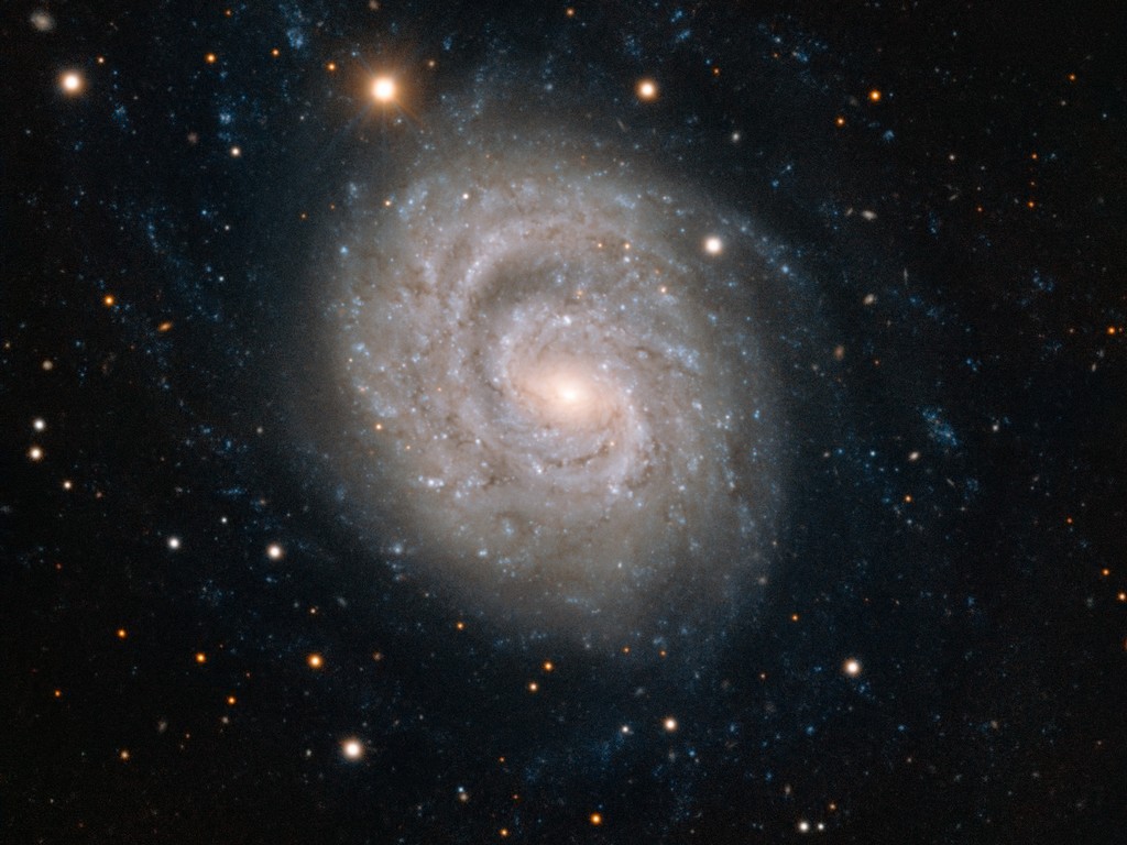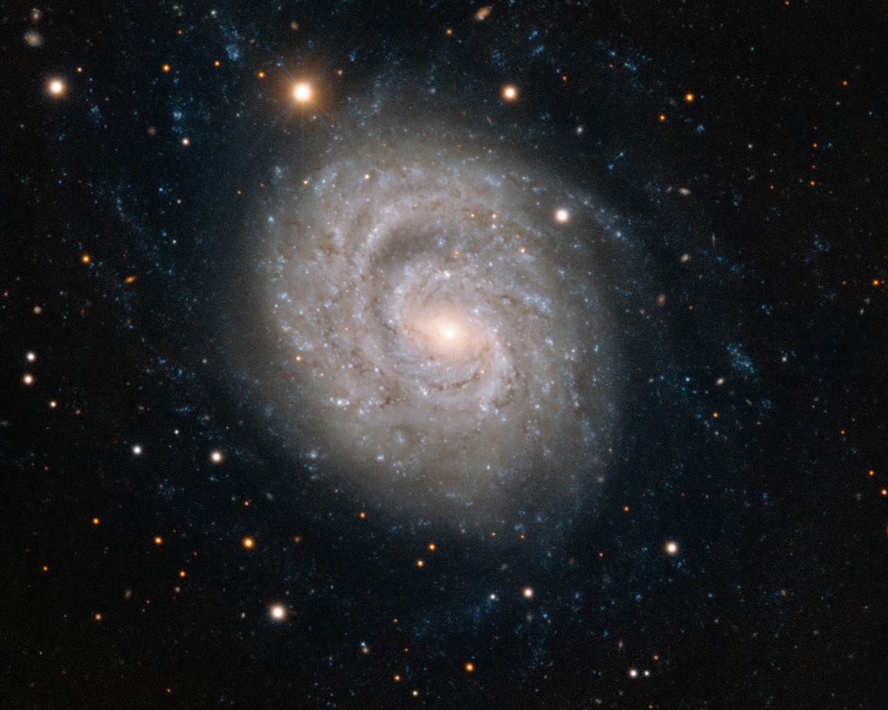 This space picture shows a ‘spiral galaxy’, like the Milky Way. Named so because of the loosely wound spiral-shape arms that can be seen wrapping around the bright galaxy centre. The spiral arms in this picture are highlighted by a bright pattern of blue young stars, glowing gas clouds and dark dust lanes.