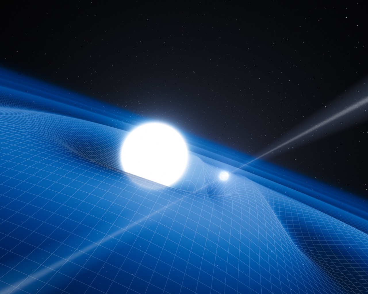 The pair of exotic stars in this picture include a white dwarf star and the most massive neutron star ever seen! As the two stars move around each other, they create ripples in the fabric of spacetime. These are known as 'gravitational waves' and they carry energy away from the star system. This picture shows an artist's impression of how this might look.