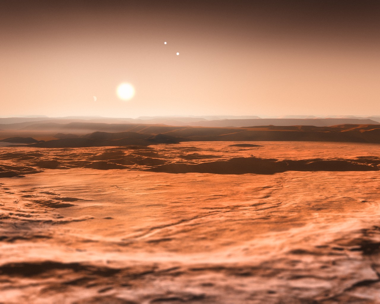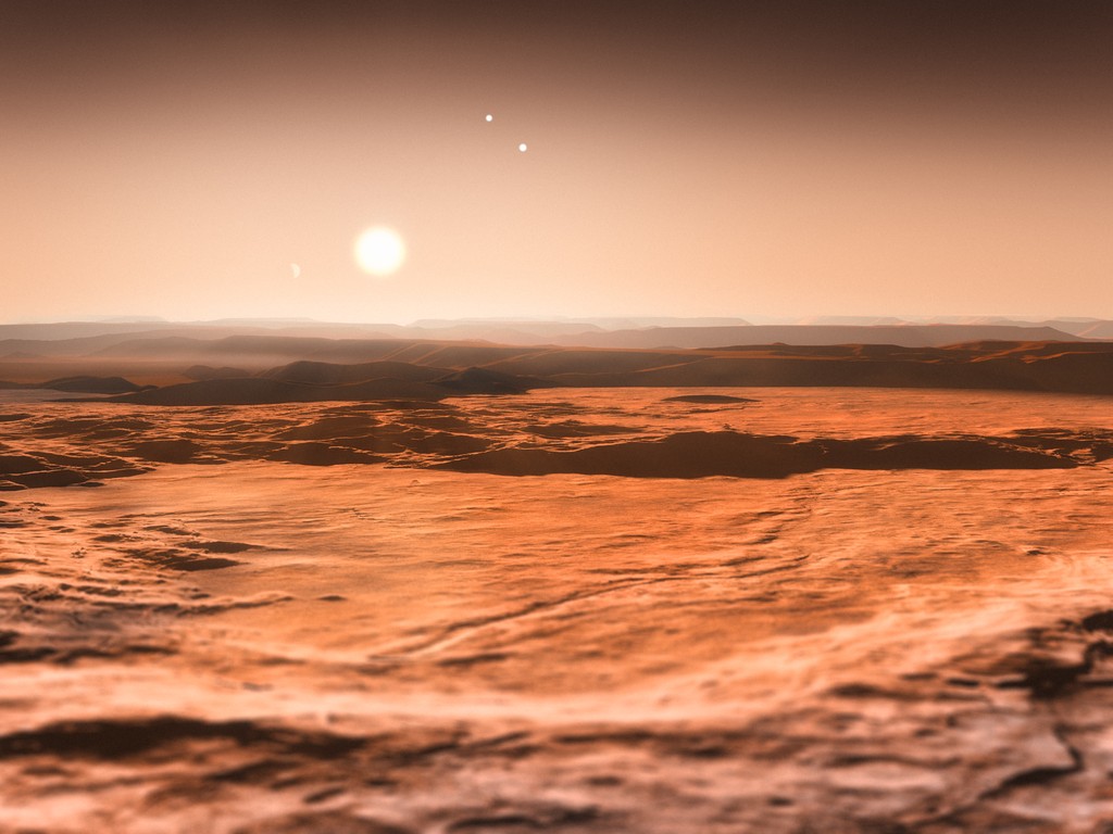 This picture is an artist's impression of how the world might look from a newly-discovered alien world orbiting around a star called Gliese 667Cd.