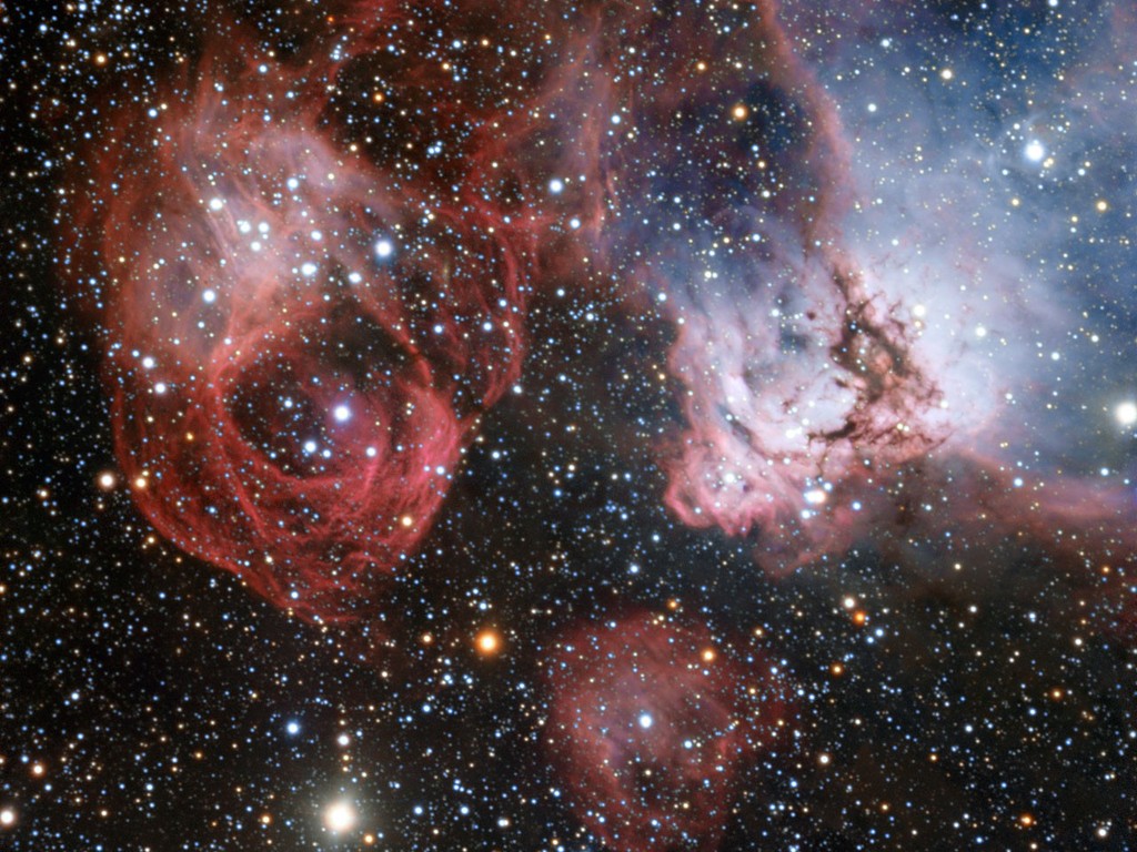 This new image explores colourful clouds of gas and dust called NGC 2035 (seen on the right), sometimes nicknamed the Dragon’s Head Nebula.