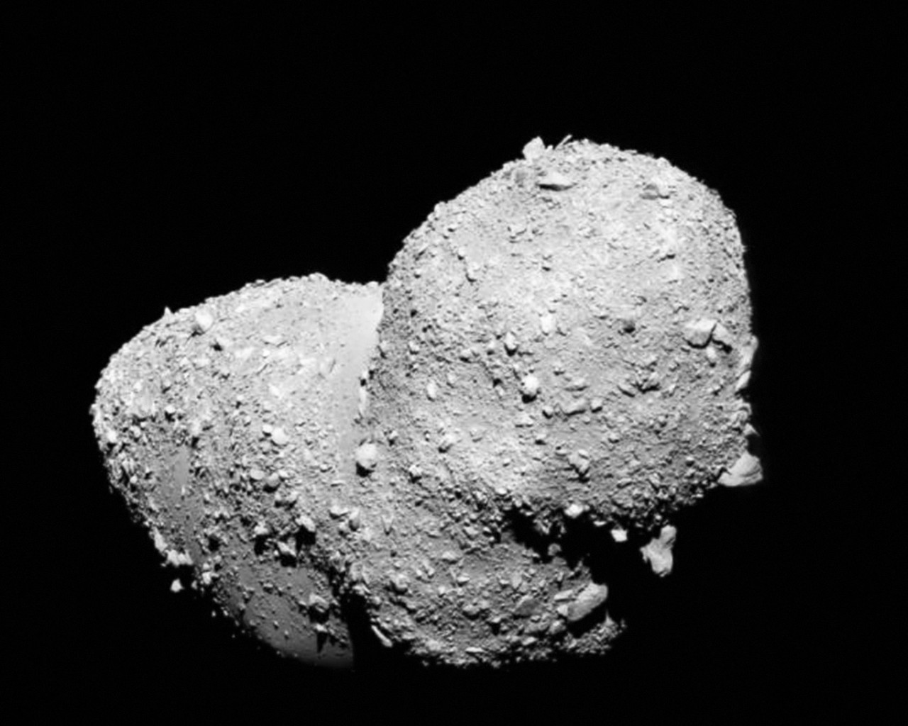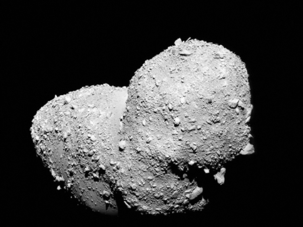 A close-up photograph of the asteroid Itokawa, taken by the spacecraft Hayabusa during its mission to the asteroid in 2005.