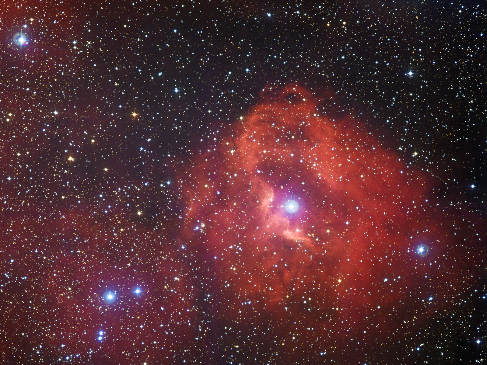 This new space photograph reveals a cosmic cloud called Gum 41, which is made up of hydrogen, the most common gas in the Universe. In the middle of this nebula are lots of brilliant, hot, young stars. The stars are shooting out high-energy light that is causing the surrounding hydrogen to glow this vivid scarlet colour.
