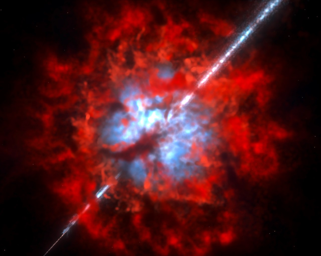 Gamma-Ray Bursts are too far away for us astronomers to be able to see all their details. Instead, an artist has created this awesome picture to give us an idea of how one might look.