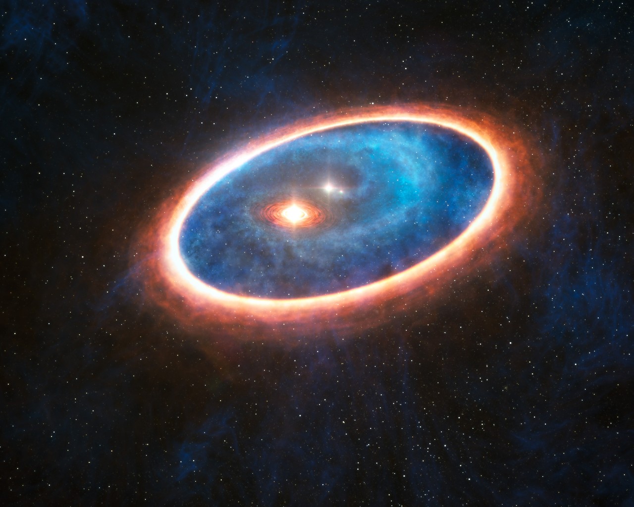 This picture was created to show two rings of cosmic dust that has just been found in a binary star system. The most exciting ring can be seen circling a star at the centre of the image. This cloud includes the ingredients for a new planet! Normally the stars in this twin-star system would gobble up this sort of cloud in no time. But this one has found a way to survive, improving its chances of one day becoming a planet!