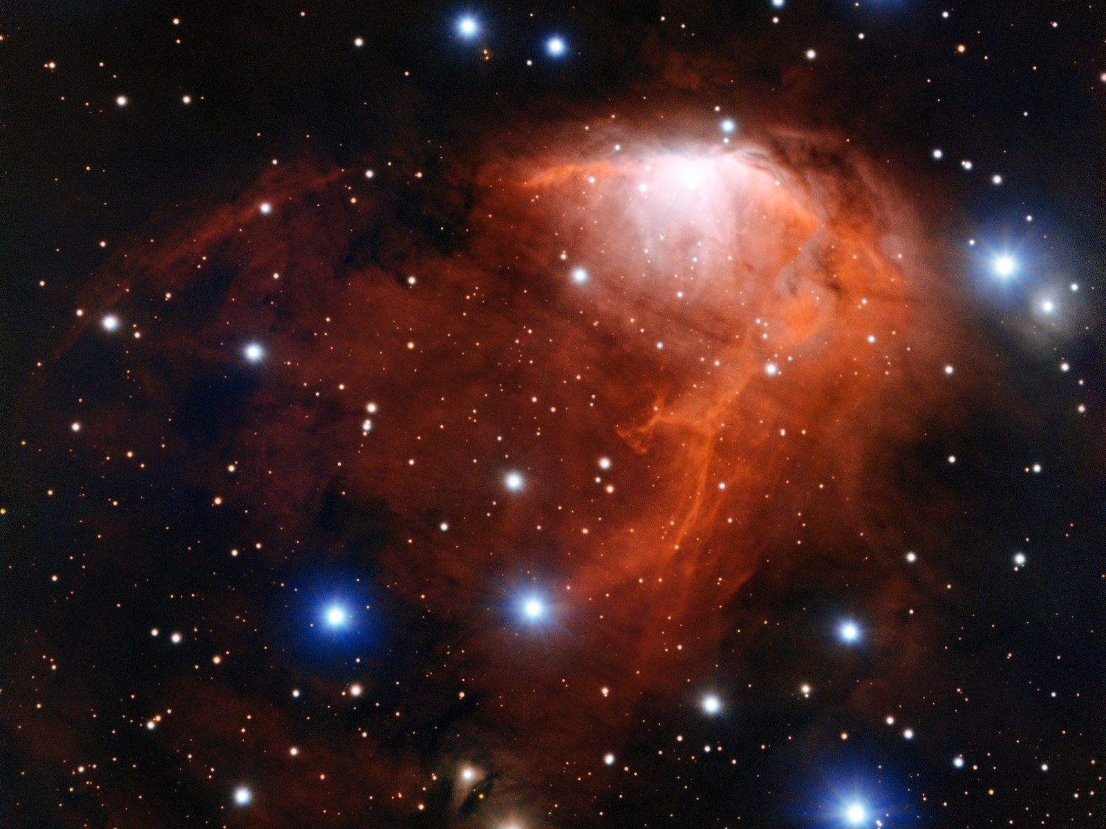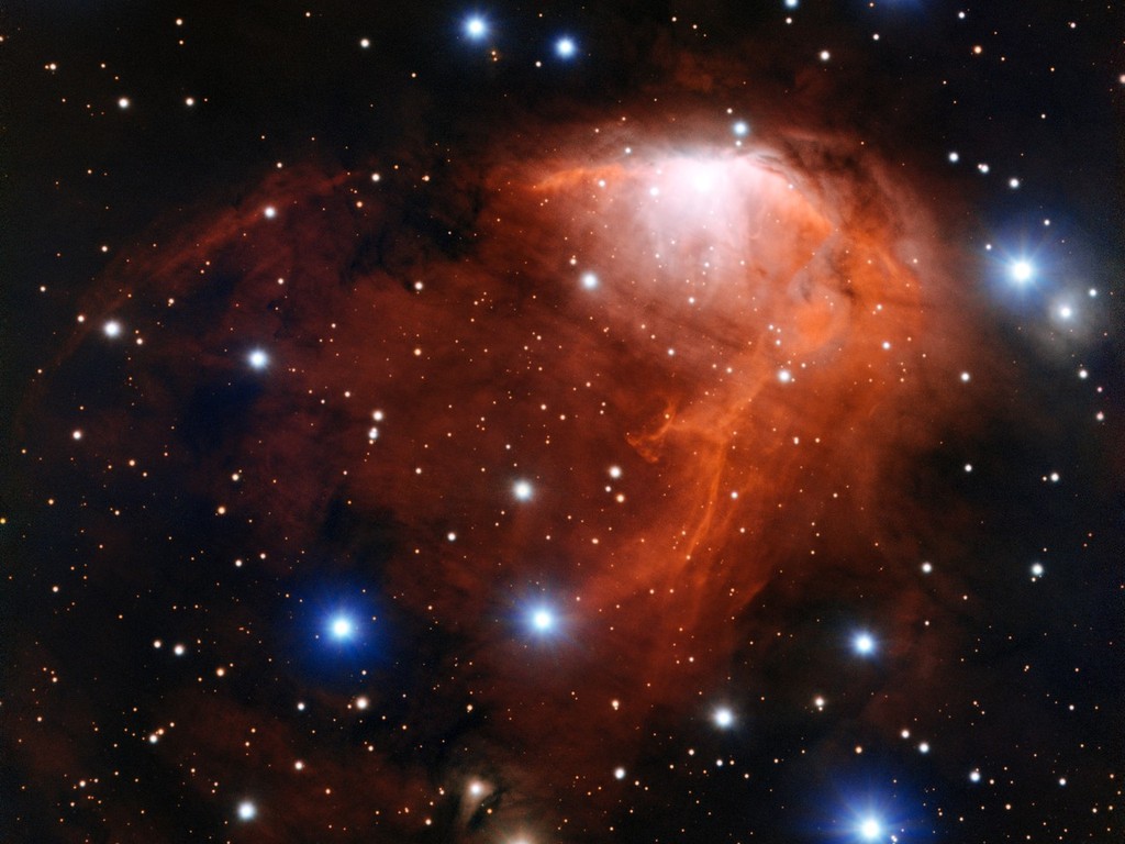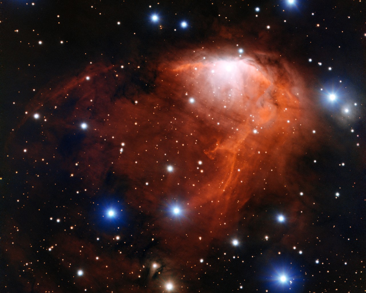 This picture shows a nebula (a cloud of cosmic gas and dust) that looks like a flame, from the rising red gas to the blue stars that look like sparks!