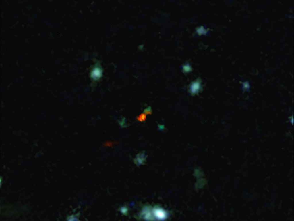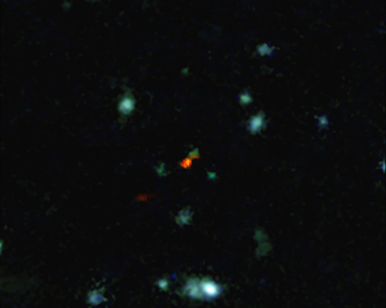 The blue-green fuzzy blobs in the picture above show some of the very first galaxies in the Universe! And The orange blob in the middle is a cloud of cold cosmic gas that is in the process of becoming a galaxy.