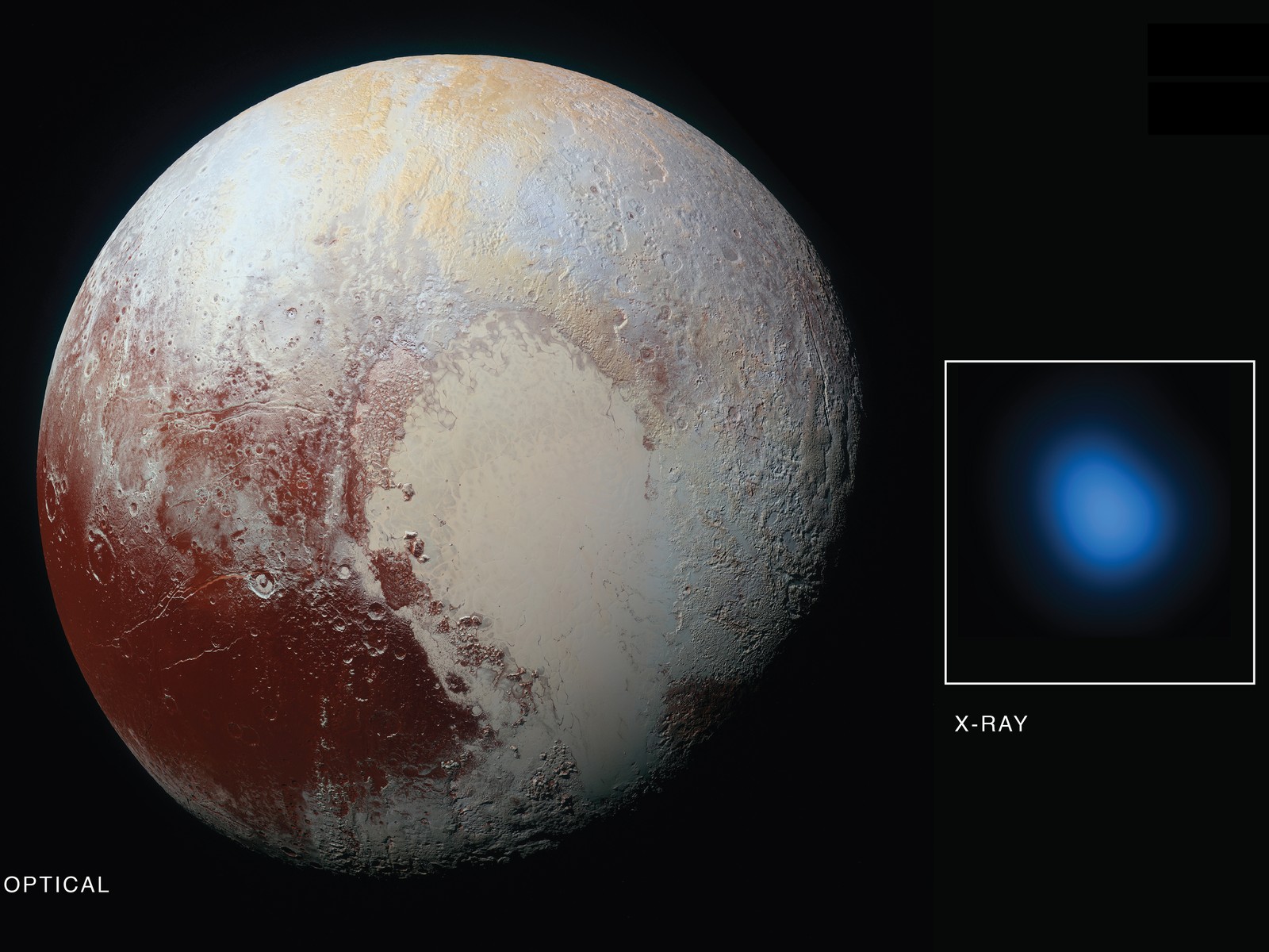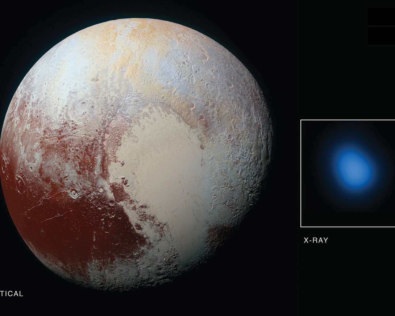 The pictures above show Pluto, a dwarf planet at the outer edges of our Solar System. The image on the left shows Pluto in normal light, and the blue blob on the right is the X-ray light from Pluto.