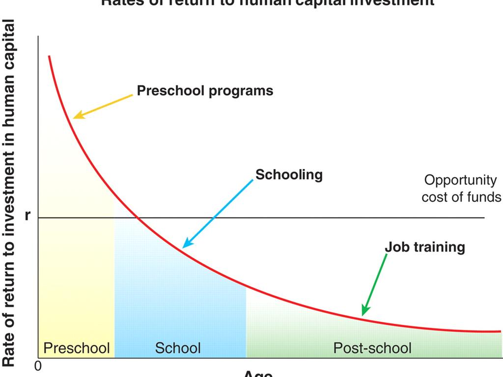 The declining figure plots the payout per year per dollar invested in human capital programs at different stages of the life cycle for the marginal participant at current levels of spending. The opportunity cost of funds (r) is the payout per year if the dollar is invested in financial assets (e.g., passbook savings) instead. An optimal investment program from the point of view of economic efficiency equates returns across all stages of the life cycle to the opportunity cost. The figure shows that, at current levels of funding, we overinvest in most schooling and post-schooling programs and underinvest in preschool programs for disadvantaged persons. Adapted from (3) with permission from MIT Press.