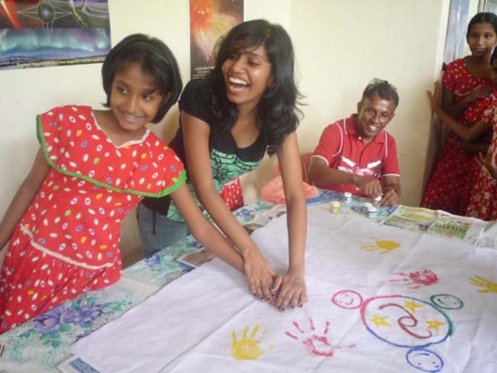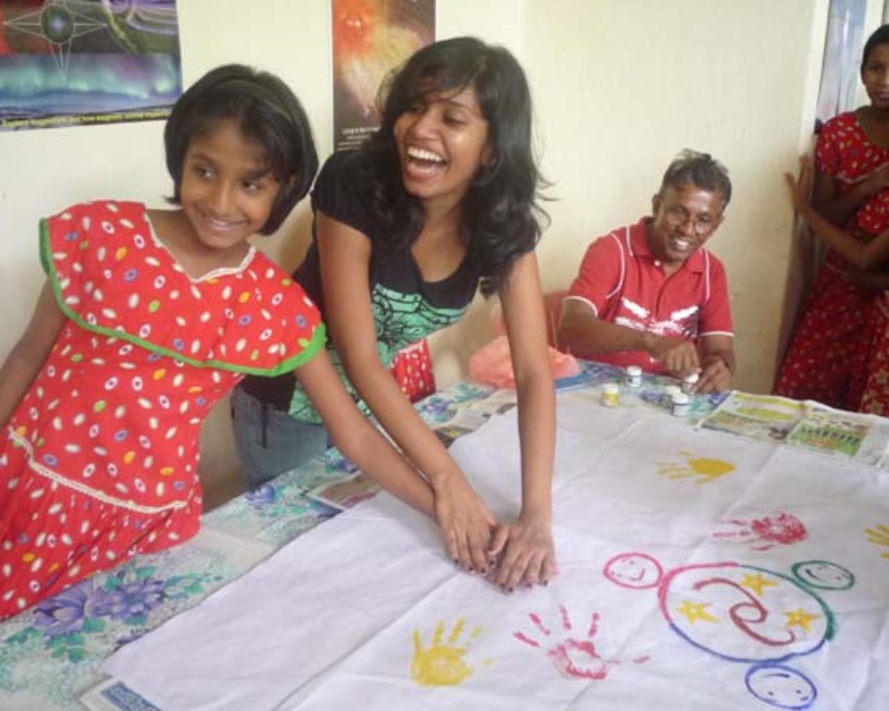 Girls from a Sri Lankan Orphanage hold a hand-made UNAWE banner. To celebrate his 24th “orbit around the Sun,” UNAWE Sri Lanka coordinator Thilina Heenatigala visited this orphanage and held astronomy outreach activities for the day.