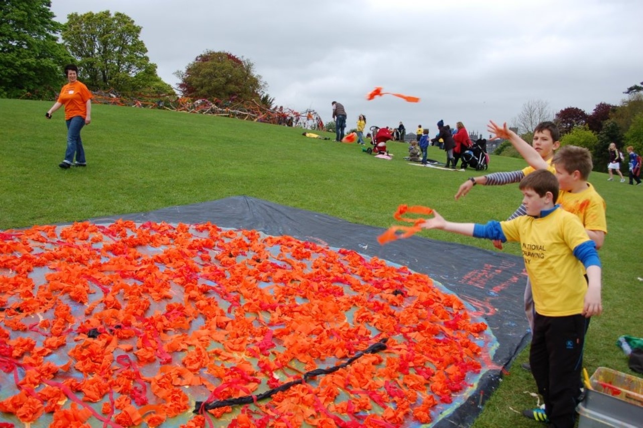 To celebrate Ireland’s National Drawing Day on 19 May, Deirdre Kelleghan, creator of the award winning Universe Awareness (UNAWE) activity Deadly Moons, used her artistic talents to give an educational workshop about the Sun at Kilkenny Castle, Ireland. In Action Sun, Deirdre recruited the help of young children to create a wonderfully textured picture of the Sun by throwing paint-covered crepe paper at a large plastic sheet.