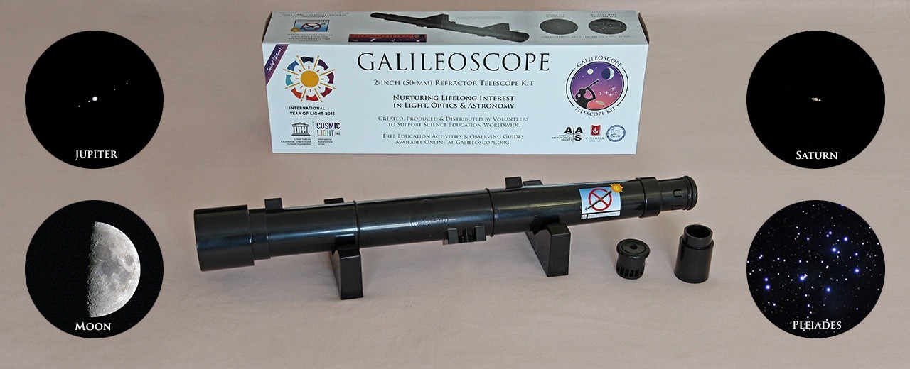 Galileoscope is one of the IYL 2015 IAU Cosmic Light Cornerstone Projects, with the goal of distributing 100,000 telescopes in 2015. There are now 225 000 Galileoscopes already in use by teachers and students in more than 100 countries.
